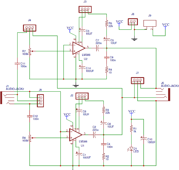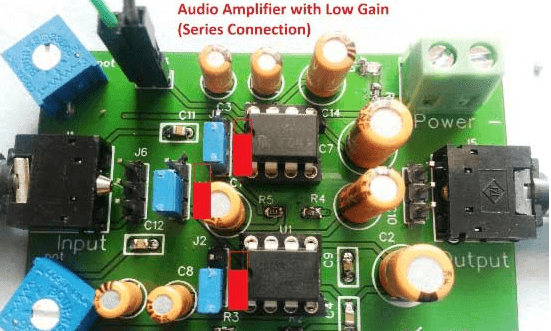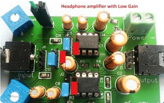 This phone electronic equipment Circuit is formed by mistreatment LM386 amplifier IC. This circuit is formed in such the simplest way that user cannot solely use it as phone electronic equipment however can also drive a subwoofer speaker or traditional speaker (4 ohms) and might get a surprisingly loud sound through the speaker. To change it between these 2 modes we've got used 3 jumpers here. Thus if the user desires to drive a subwoofer speaker then he/she simply must assemble these jumpers, as we've got explained below. Here we've got used 2 LM386 and user will use three volts to nine volts to drive this circuit. We've got explained the jumpers configuration below in four cases, to drive the phone or Speaker with Low or High gain. We've got used Red color rectangular image to denote the position of Blue jumpers, follow the red image to assemble the jumpers: