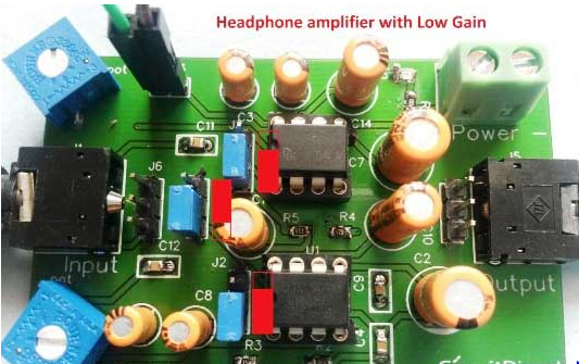 To use it to amplify Headphones output, we will assemble the jumpers as shown in below image, during this case each LM386 ICs work severally for left and right speaker with low gain. User will set the degree for each the speakers of headphones severally by mistreatment 2 given potentiometers.