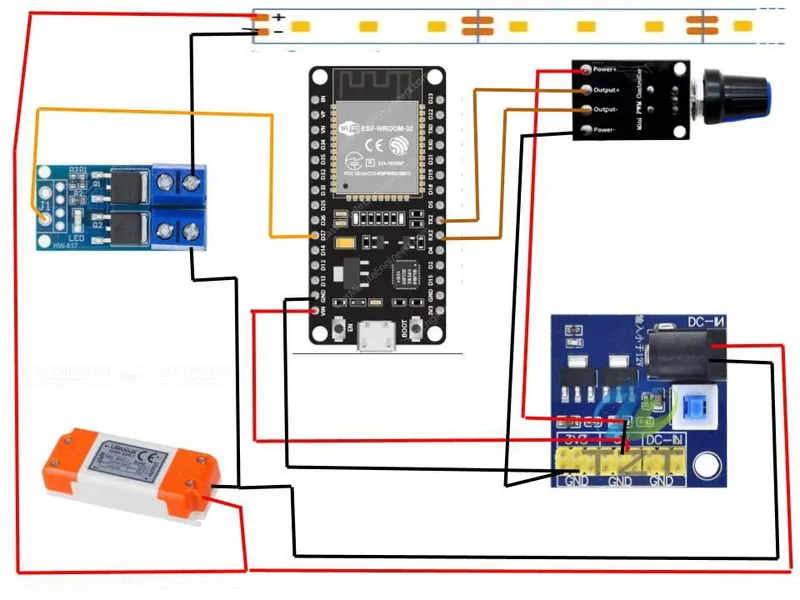 • I interrupted only the negative wire going to the LED strip power supply using the MOSFET Trigger, as it only cuts the negative. The control is connected to GPIO27 on the ESP32.