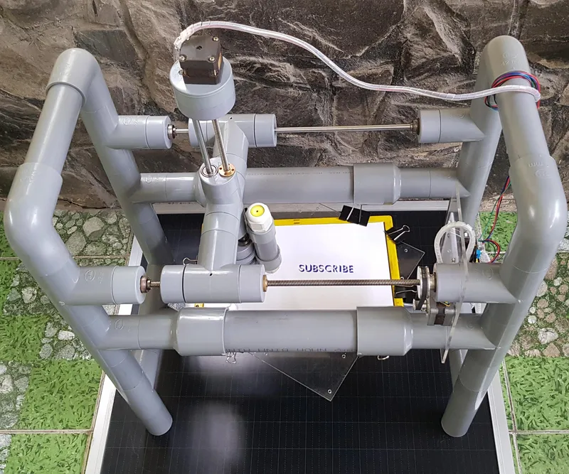 Put the desoldering gun tube inside a small pipe, lock it by 2 cable glands at 2 ends then connect this pen holder to Z axis working base. There is a small gap between the bottom cable gland and pen, which ensures that the pen tip can move up and down when a drawing surface is not flat.