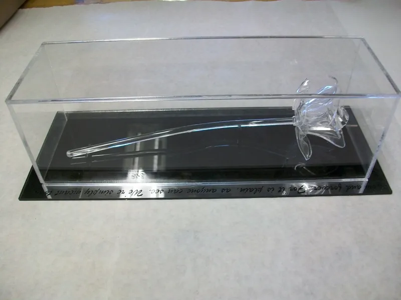 I then cut out pieces of 1/8" acrylic on the laser cutter, to make a box that fits over the rose. I used the Weld On glue to put it together. It fits on the outside edge of the black acrylic on the base. This box protects the rose from damage, and allows it to be displayed.