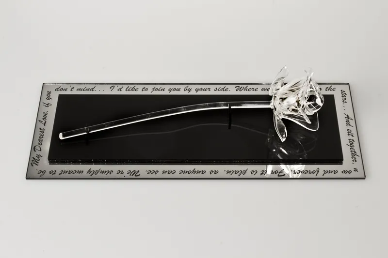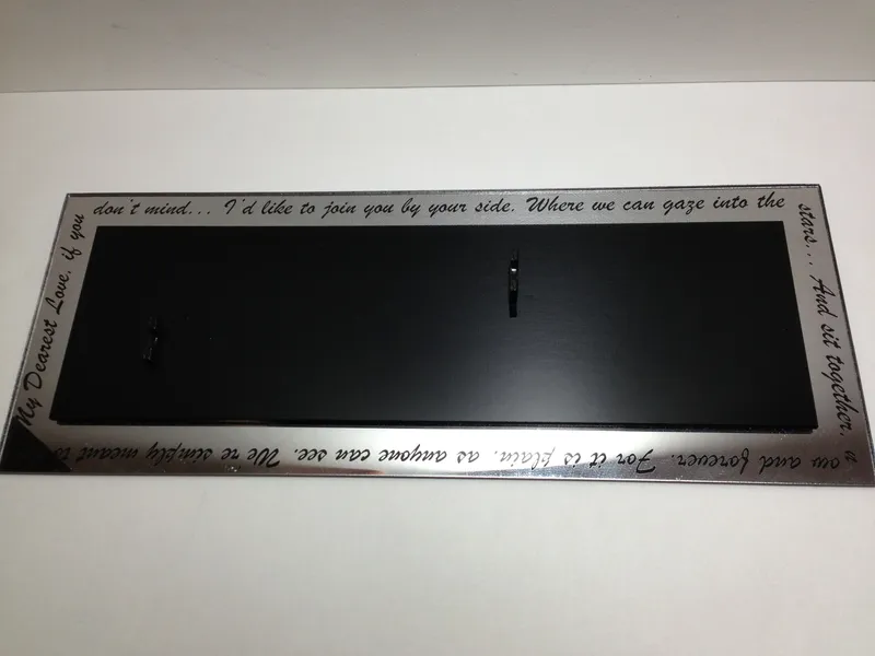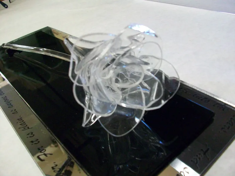 In order for the words to etched correctly, they had to be reversed because I was doing a reverse etch on the back of the mirrored acrylic. After it was cut out, I spray painted the back of the acrylic black so the text would show through it. Then using a piece of black acrylic, I cut a smaller base piece that was glued to the top of the mirrored piece of acrylic. I then glued the two stem holders onto it to hold the rose in place.