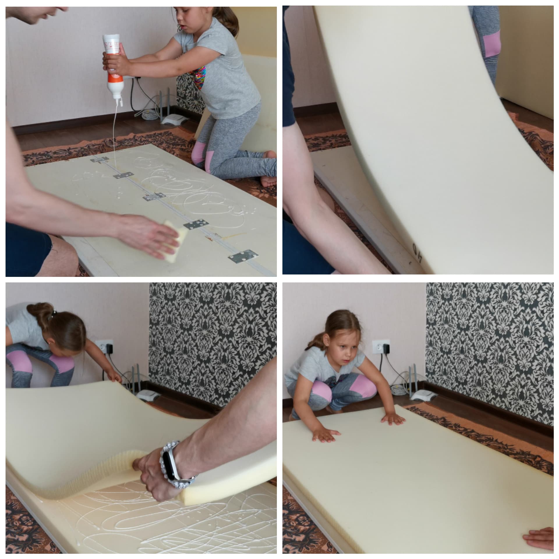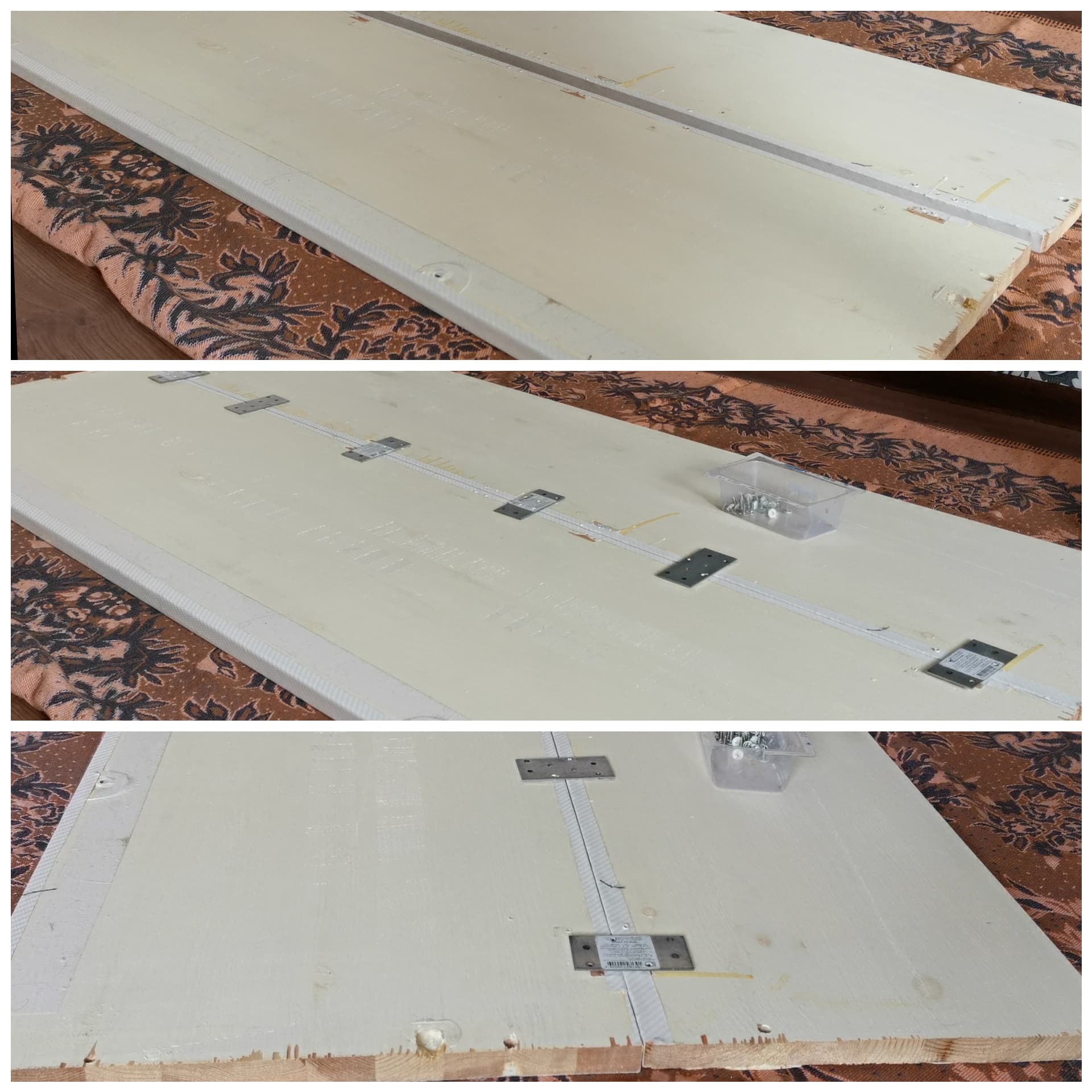 For the sofa base i used 2 old pine wood furniture boards (150*36 см). I connect them together with metal plates. My little dother helps me, so work goes faster and easier. It's always great to work with helper!