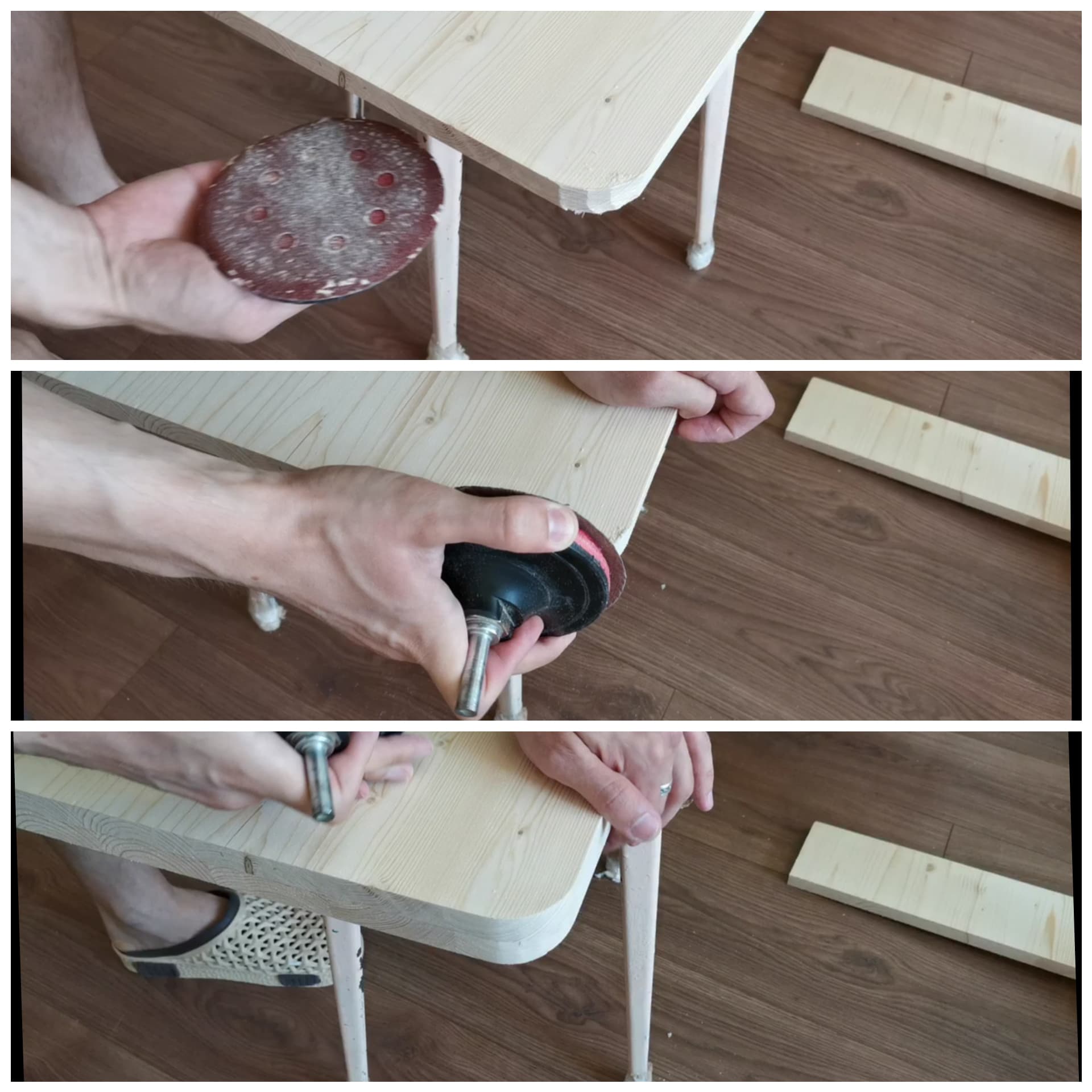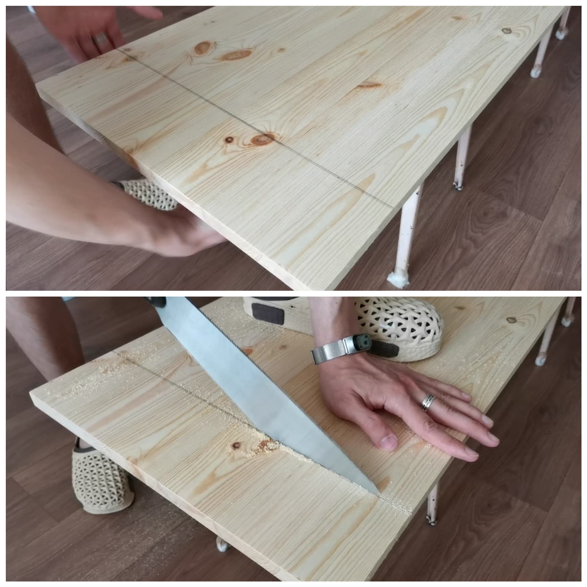 From the bottom of the base, i decided to add some pine boards. In this way it will be more durable. I cut boards with japanese saw, then connect them together. I used my homemade pocket hole jig.