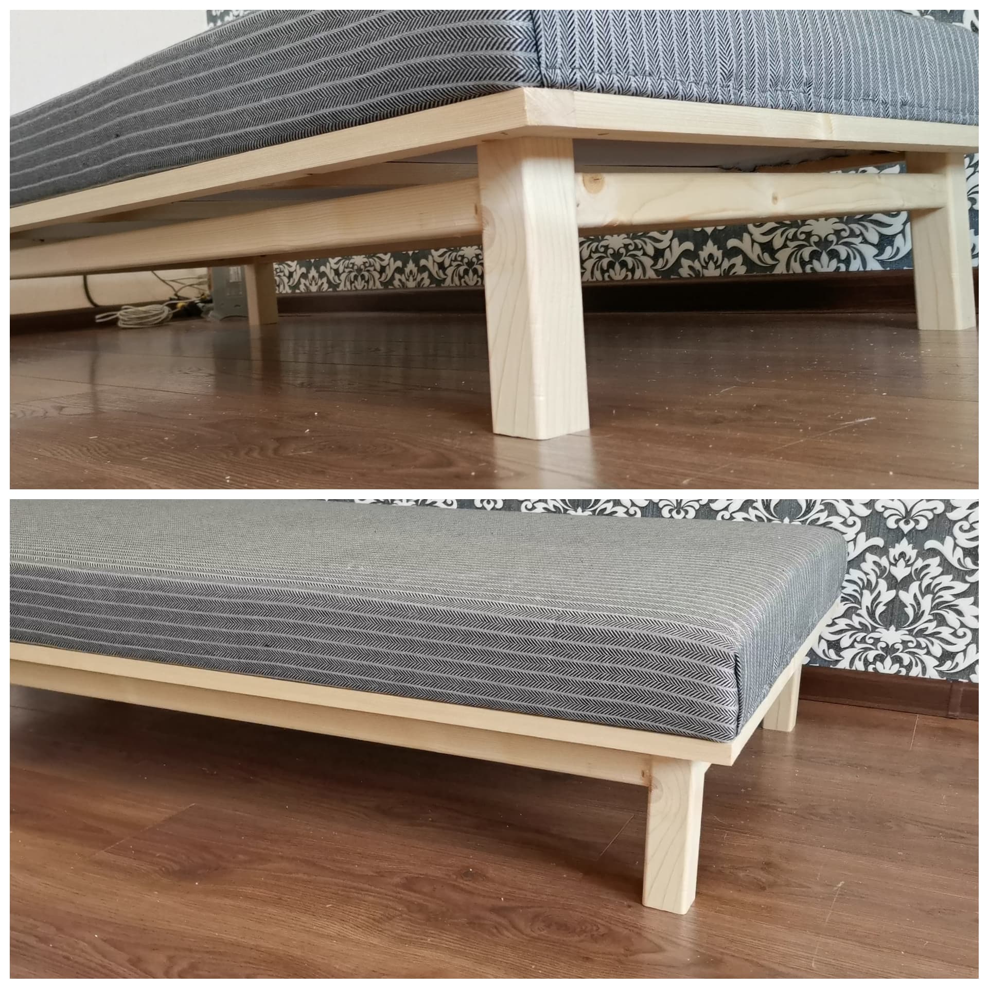 Now i fixed legs to the sofa base. I fixed them with clamps. To connect legs between them together, i used pine boards 35*35mm. I fixed them with pocket holes and some glue.