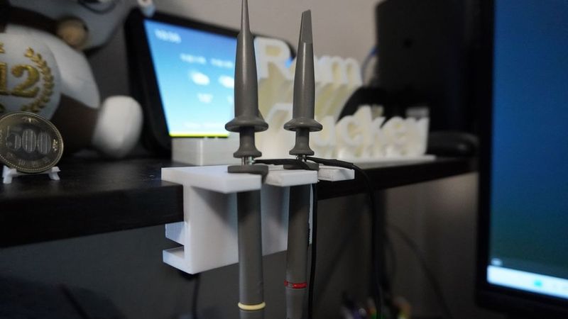 This is an oscilloscope probe holder. It can accommodate up to two probes. Additional machining with an M3 tap is required