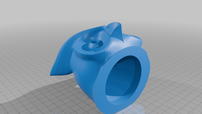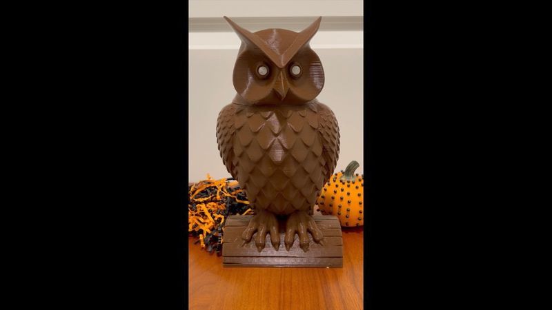 The nathanstenzel remix separated the owl's head from the body and created a small storage space inside a 6-inch owl. My remix involved: (a) scaling the model about 170% to create a 10-inch model with a neck wide-enough to accommodate a small servo, (b) adding two small vertical posts on top of the body to keep the servo-holder in a fixed position, (c) hollowing the eyes (for RGB LEDs), and (d) adding a hole on the owl's back side for connecting wires from the servo, motion sensor, and LEDs (mounted inside the owl) to a microcontroller (located outside the owl). With electronics added, the end result is an owl whose head will swivel to either side while its eyes flash red and orange (or any other color) whenever someone triggers the "radar" motion sensor mounted inside the owl.