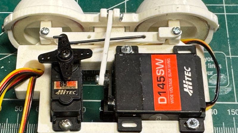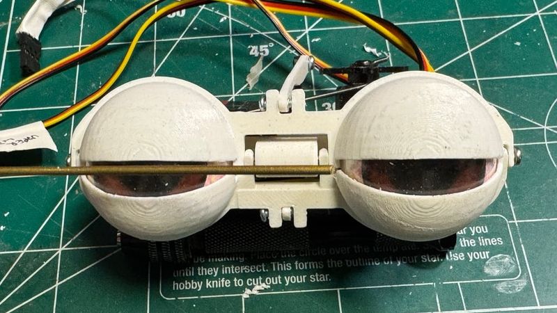 Simple three-servo mechanism of eyes looking left and right and blinking. There is a build video on my YouTube Channel. Free to use, please share your versions and builds. There is a vacuum form buck for the eyeball lens. A one mm sheet of plastic is planned for that lens.