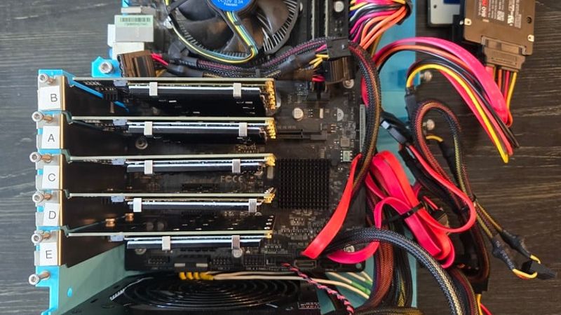 -5x PCIe to M.2 SATA conversion cards: (https://www.amazon.com/dp/B0C9TJC6V4?ref_=ppx_hzsearch_conn_dt_b_fed_asin_title_4&th=1)
