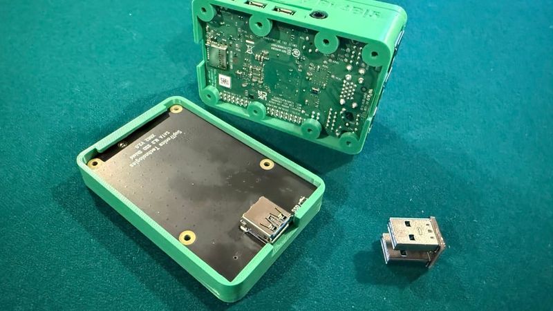 There is also an option for an SSD to be mounted under the case. The X862 SSD module is placed underneath of a Pi 4B case and assumes the use of a Geekworm X862 V2.0 card. Given the dimensions of the X862, it would be recommended to use the 'bottomx' STL file for the bottom cover. Use four 25mm M3 screws to hold everything together. This currently can't be used with a Pi 5 due to the difference in USB part placement on a Pi 5 (2.1mm difference), where the USB connector for the X862 will not work.