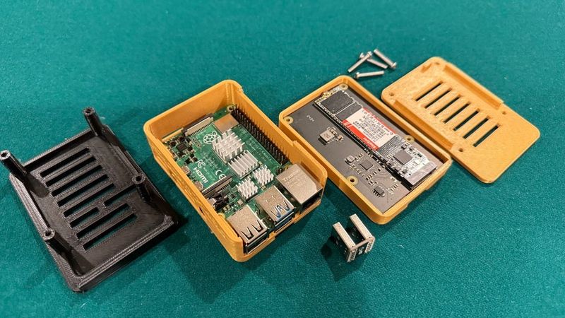 When both an SSD and HAT are used, the bottom cover should be secured using 5mm screws, using the 4 mounting holes that do not line up with the screws used for the HAT. Note that where the bottom covers have 8 mounting holes, only 4 are needed, where the specific 4 used are chosen based on whether a HAT or SSD module is used. If feet are used (best printed using TPU), the bottom screws may need to be up to 10mm in length, where care is taken that the end of the screws do not touch the underside of electronic circuitry.