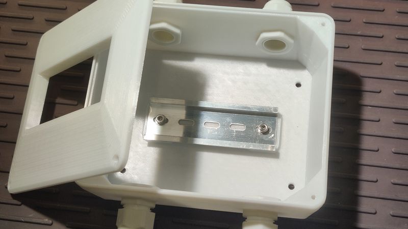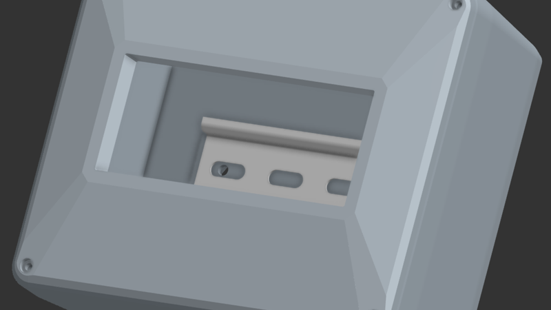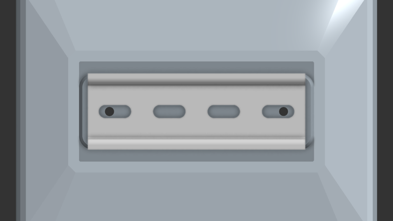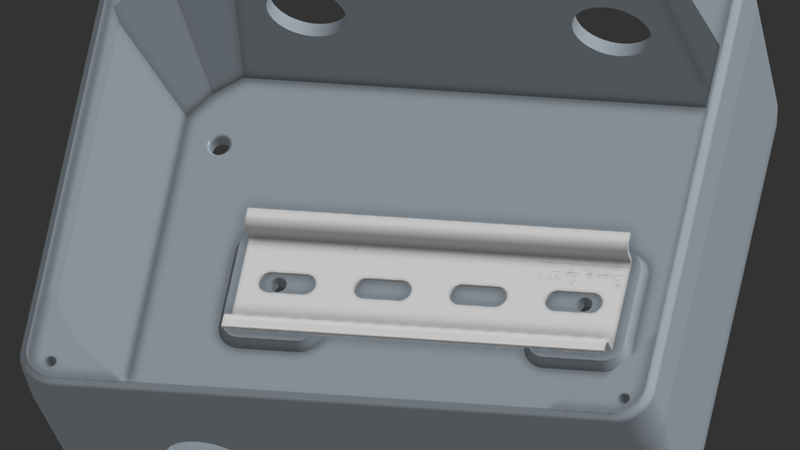 The DIN rail mounts to the case with two M4 x 8mm bolts. There are slots for M4 nuts on the rear. Attach the faceplate to the case with M3 screws - they should self-tap if printing tolerances are correct. The holes on the top and bottom are sized for M20 cable glands to mount on snugly, and at a slight downward angle. There are four 5.0mm mounting holes on the inside of the case if you desire to fasten it to a surface.