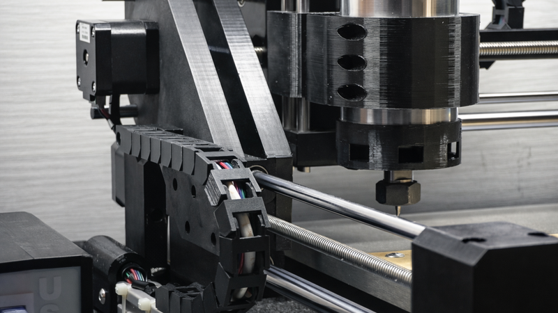 Special attention should be paid to parts that experience increased mechanical load or are located close to the spindle. Elements that are in direct contact with the spindle or operate in the heat-affected area should be printed from heat-resistant materials. PLA is not recommended for these parts; PETG, ABS, or various composite filaments are more suitable choices. Heavily loaded structural elements, including the main gantry mounting parts, should also be printed with relatively high infill to ensure sufficient stiffness and durability.