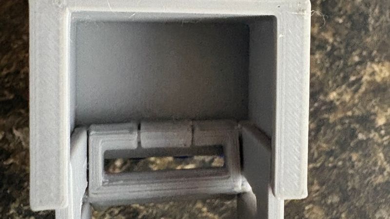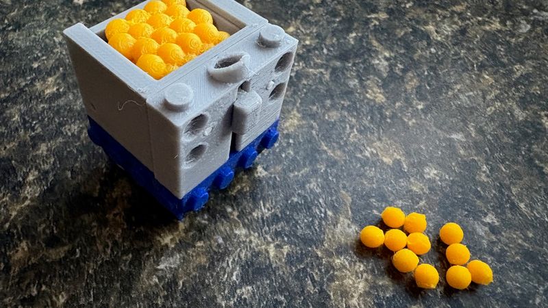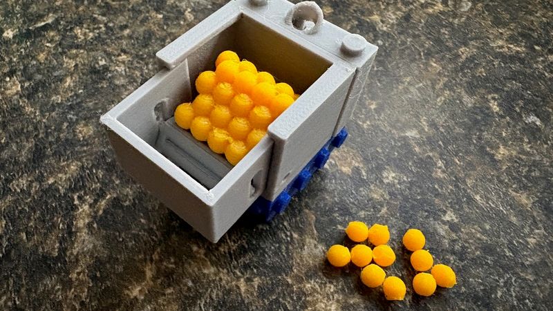 * Hopper: Composed of a fixed section that attaches to the robot, a moving section, and an intake. The intake automatically deploys through the expanded hopper. Assembly requires a piece of 1.75mm filament. This should be inserted through both hopper sections and intake, all in deployed/expanded position. The filament should be sized to be within the moving hopper, so only engages with the intake and inner hinge. In other words, the holes in the sides of each hopper are only for assembly. The hopper also comes with an L-shaped piece of fuel that looks like a full hopper when closed, and a pile when open.