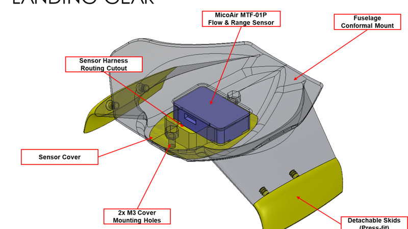 - <b>Conformal attachment</b> with slot for mounting <b>MicoAir MTF-01P flow sensor & range finder</b>, improving low altitude hovering accuracy.