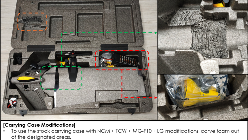 - <b>To use the stock carrying foam case,</b> refer to the attached photo for foam cutout locations.