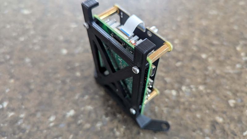 The Pi and HAT assembly mounts to the existing base from the original thing or the remix base using three M2.5 bolts threaded up from the bottom of the base into the standoffs that ship with the Geekworm adapter. I used M2.5 x 16mm, which are a bit long but work fine. I first tried M2.5 x 10mm and found they were too short.