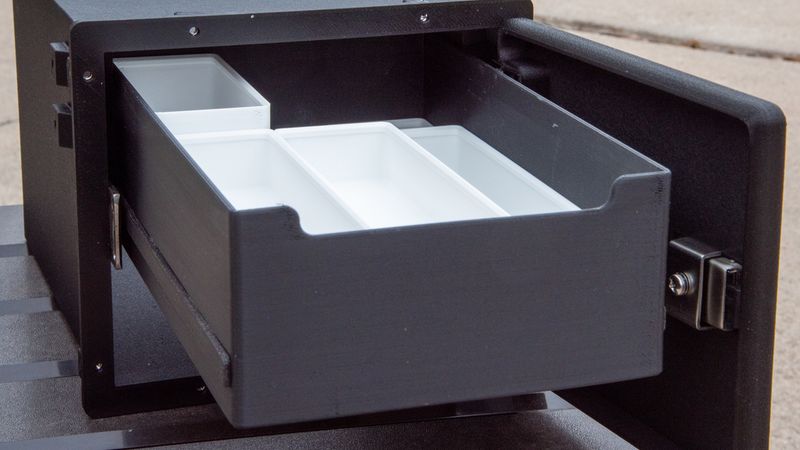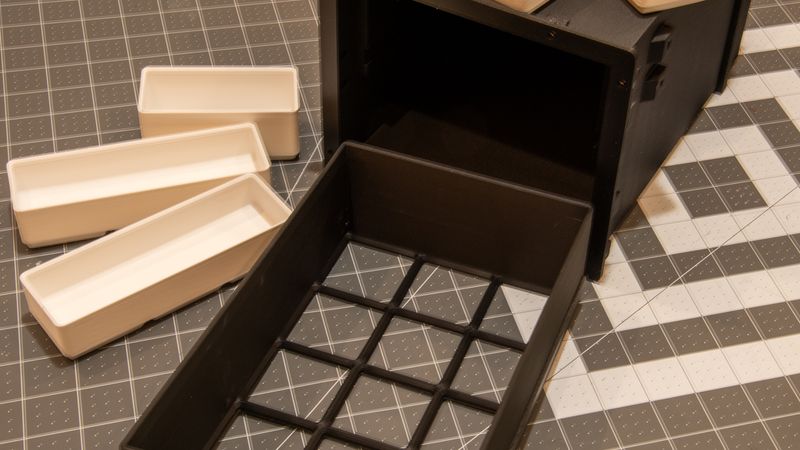 There is an option to add a drawer which accepts Gridfinity bins. If you design your own bins using the Fusion Gridfinity Generator plugin, you will need to change the base width unit and base length unit size to 45.8mm. A basic set of bins are included in the files, but the Fusion plugin is very handy if you want to modify the size of the bins to fit your own needs. The drawer has two long slides which must be CA glued to the drawer. The drawer slides which attach to the enclosure are different with the thicker one needing to screw into the hinge side of the enclosure. I used a small amount of wax to allow the drawer to slide smoothly on the slides.