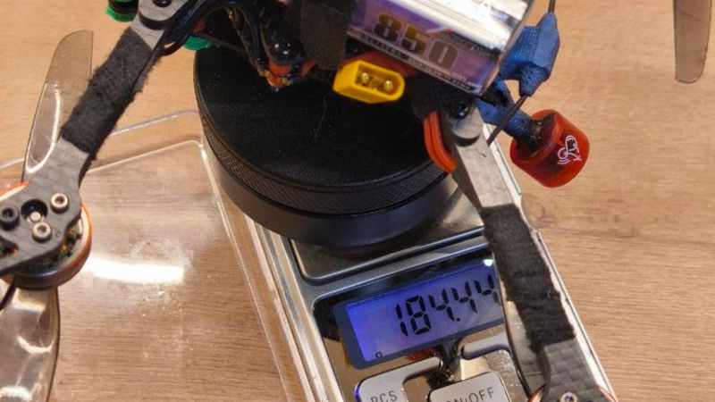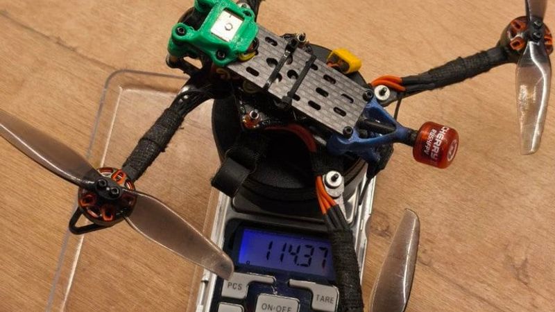 Weight without battery is 114 grams and weight with 850mah 4s is 185 grams.
