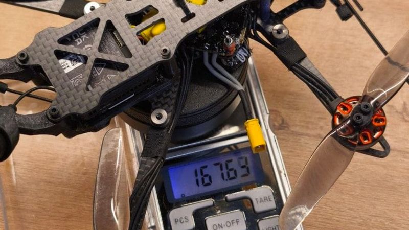 Weight without battery is 168 grams and weight with 850mah 4s is 238 grams.