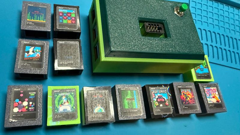 Cartridge parts: I designed the cartridge to perfectly fit the EEPROM breakouts that I was able to get and position the breakout solder pads in just the right spot in the edge connector to make the best possible electrical contact. It also helps to add a little solder to each pad to ensure good contact, but it's not a hard requirement. Just drop the EEPROM breakout in to the back piece and the peg should go through the hole in the center of the PCB holding it in place. Next, slide the top half down until it clicks into place. There are two different cartridge fronts, one with an inset for printed game artwork to sit into. Most importantly, the cartridge back has a notch in the edge that matches up with a key in the cartridge slot to make sure games cannot be plugged in backwards as this would result in 5V DC being supplied to the data lines and might damage the EEPROM.
