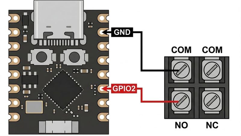 Before assembling, solder two wires GPIO2 and GND on the ESP32-C3, and connect the other ends to NO (Normally Open) terminal and the Common terminal on the button.