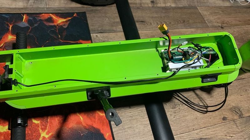 Finally, an important note: Working on electronics, especially in connection with power sources like batteries, requires extreme caution. Please only attempt this if you have the necessary experience and knowledge; otherwise, there is a serious risk of injury and fire. Additionally, ground clearance is reduced, as you can see in the photo, so please keep this in mind when driving. The electronics are also no longer sealed against rain and splash water like the original. Therefore, driving on very wet roads or in the rain is not recommended, or everything must be properly sealed.