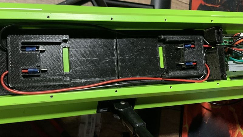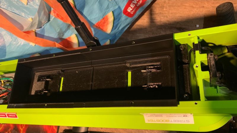 Hier mein Akku umbau für einen Streetbooster one e-scooter. Die Akku aufnahme muss doppelt gedruckt werden. Die original Schrauben könne verwendet werden. Die Kabel Abdeckungen sind teil der Halterung und dienen auch der stabilität der kostruktion. Die original Batterie Abdeckung muss entsprechend wie auf den Fotos zu sehen ist ausgesägt werden. Bitte meinen Schnitt nicht genau betrachten zum schluss geht mir bei solchen Projekten meistens die geduld aus XD. Für die Verkabelung hab ich 2,5 mm2 Kabel verwendet. Die Flachstecker sind mit Heißkleber eingeklebt. Wichtig: Die akkus müssen in reihe geschaltet werden damit sie die nötige Spannung von 36V erreichen. Die Kapazität der Akkus (bei mir 4Ah) ist fast nur halb so viel wie der Original Akku. Die belastbarkeit der Akkus schätze ich auch etwas geringer ein als im Original. Also bitte keine Wunder erwarten.