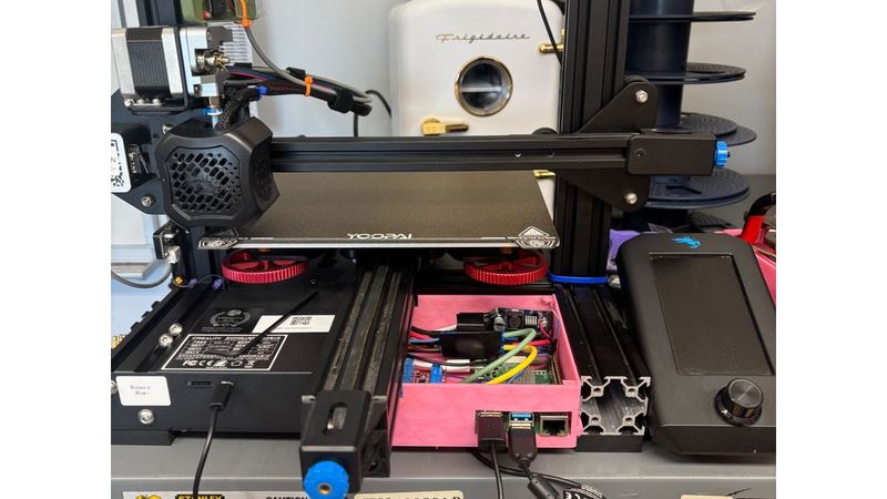This design mounts under the bed of an Ender-style printer and uses a drawer-style base + internal shelf layout to organize everything neatly. The Raspberry Pi sits in the main compartment while the relay module and buck converters are positioned above/alongside it for better use of space and cleaner wiring.