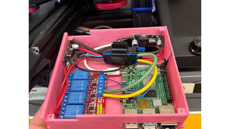 I made this because I couldn’t find anything that cleanly fits a Raspberry Pi 4, relay module, and DC step-down converters all in one compact setup—especially mounted directly on the printer.