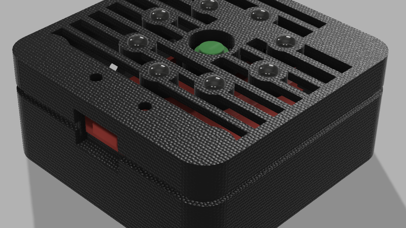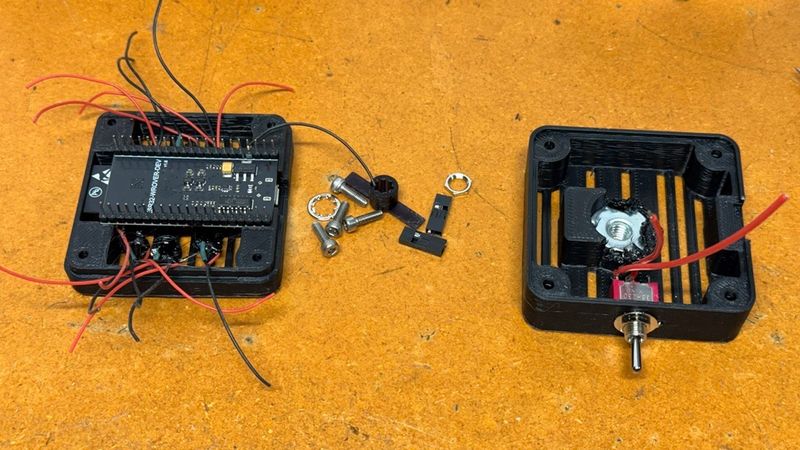 The ESP32 Wrover board rests in the notches on the top of the case, and is held securely once the bottom half of the case is bolted on. Assemble the 2 halves of the case with 4@ M3x8 (or longer) bolts. The bolts tap directly in to the plastic.