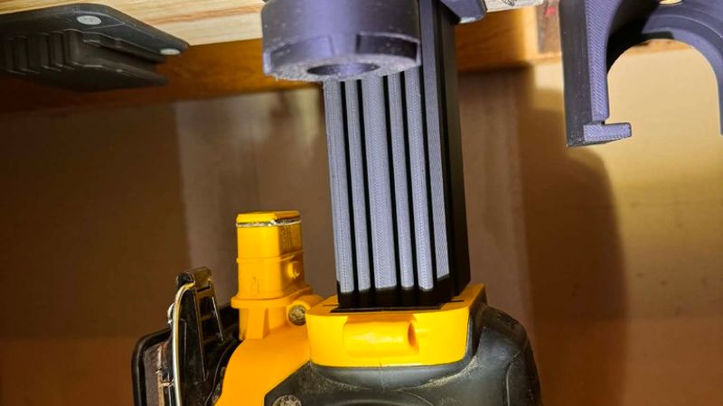 This is a simple vertical mount designed to hold the dust collection bag (“sock”) for the DeWalt DCW200B Palm Sander. It should fit the dust bag from the DeWalt DCW210B Orbital Sander as well.