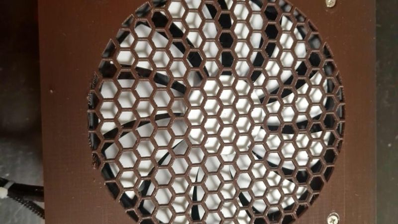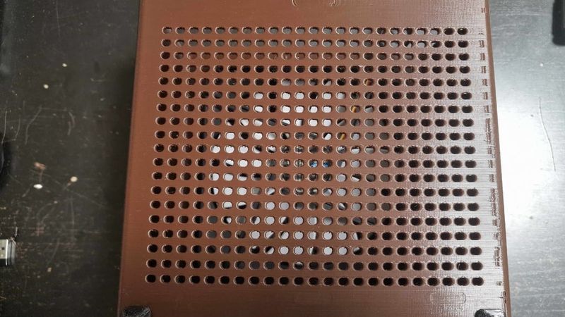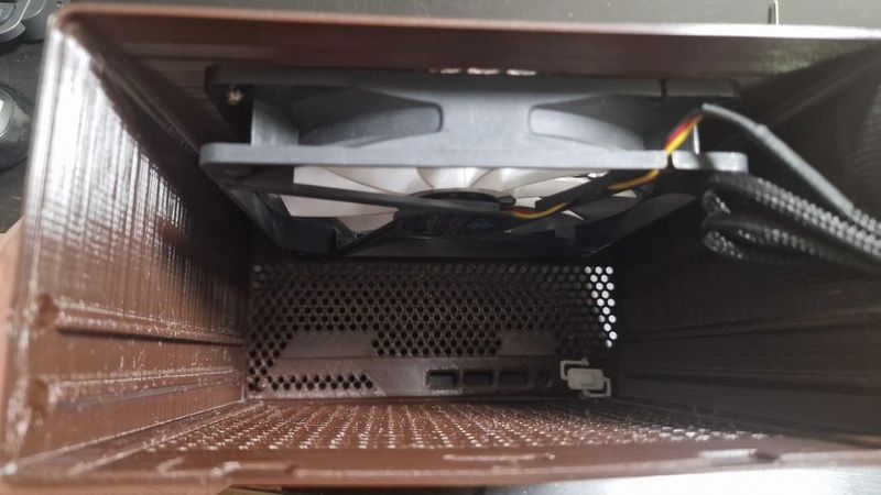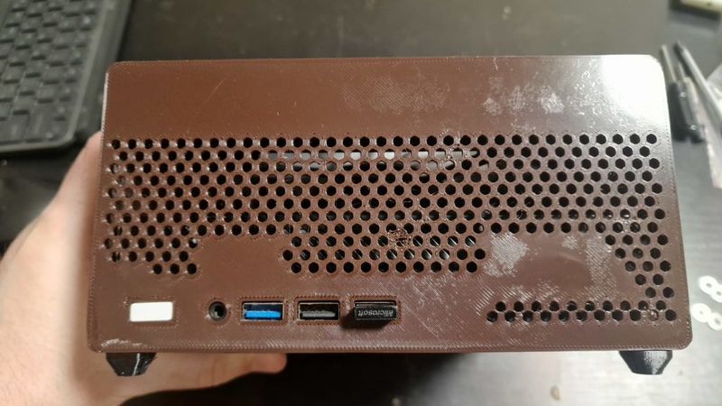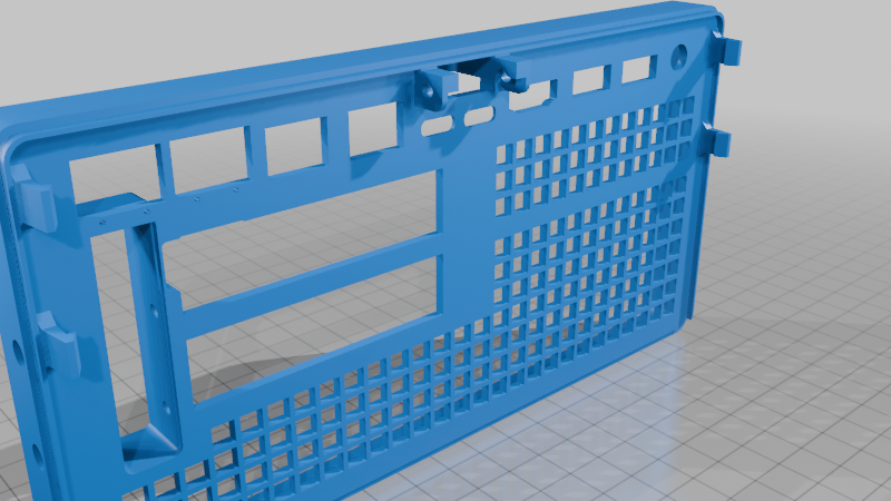 The hardest part is printing the rear panel. I only got consistent results by printing it face-down on the bed with lots of supports. But in that orientation, the latches may break (and they are important here). Another option is to print it vertically with the bottom side on the bed, add a brim, and generate supports for the latches. In that case, I would also add supports for all connector cutouts (for maximum accuracy), the wide GPU opening, and possibly the GPU bracket opening. The grille prints fine without supports—just with bridges.
