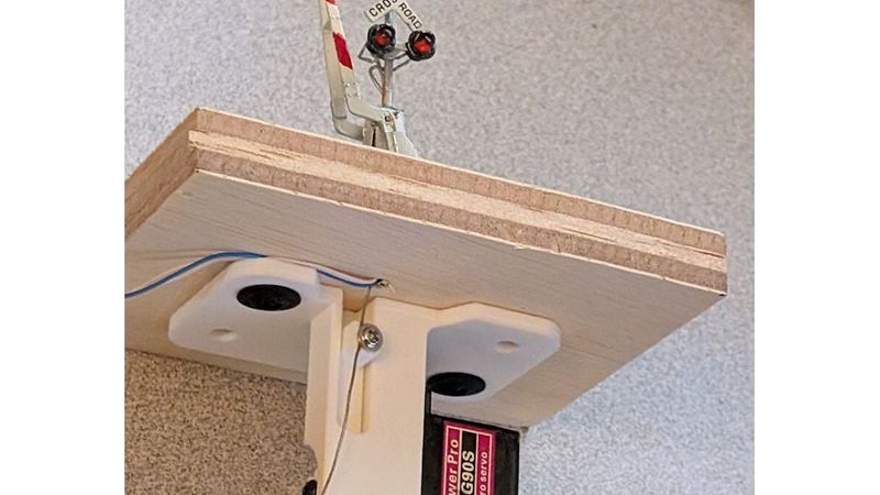 Here's a rack/pinion mount for MG90 9g servos make controlling model grade crossing signals, semaphores, and other layout animation easier.