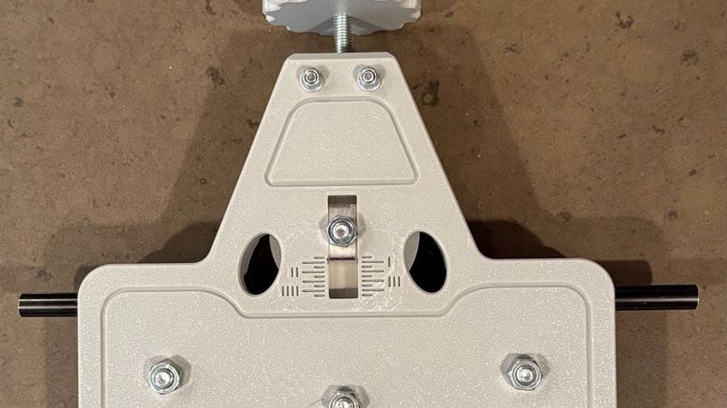 2. Insert your mast stock until it contacts both lower rollers. Gently tighten the knob until the upper roller makes contact with the mast. The center roller will touch about 75-100mm from the end of your mast tube. Take a look a the location marks on the side of the frame and note where the lower point of the bracket is.