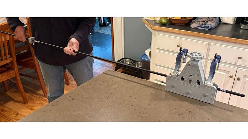4. Push the mast through the roller. Don't twist the mast as you insert it. Stop where you want the bend to stop and pull the mast back out. You may need multiple passes. You may bend it too far. If you do, then you can turn the mast 180º, adjust the knob, and roll it as needed to correct it.