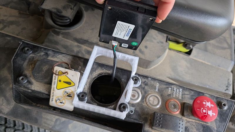 Simple bracket that mounts the newer DCHouse LCD to the control panel of the Ryobi RM480e riding mower with existing bolt locations.